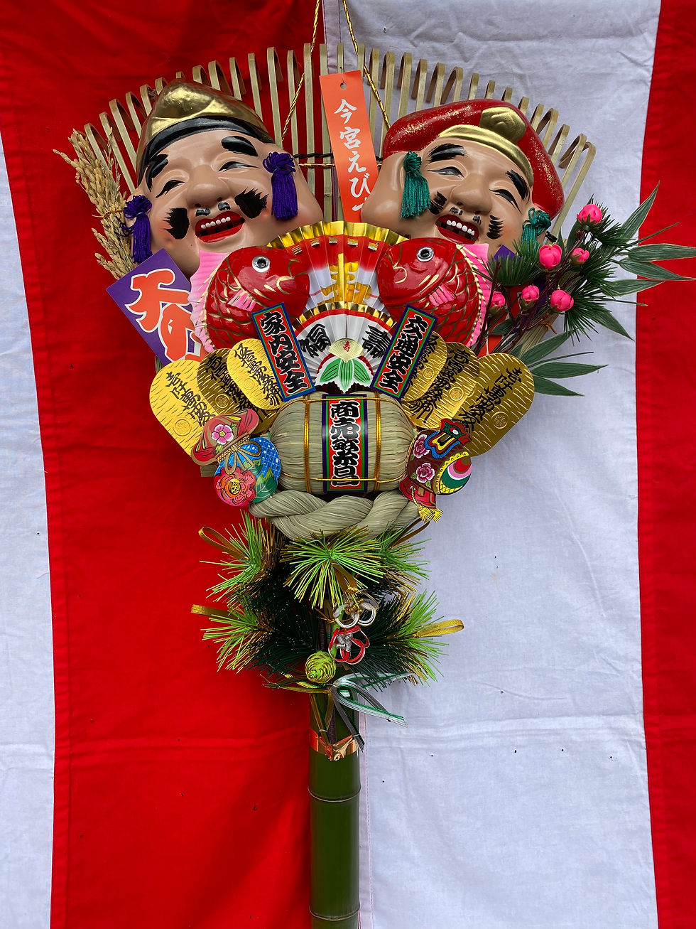 熊手で福を引き寄せて商売繁盛。面は国産の焼き物。持ち手は青竹。