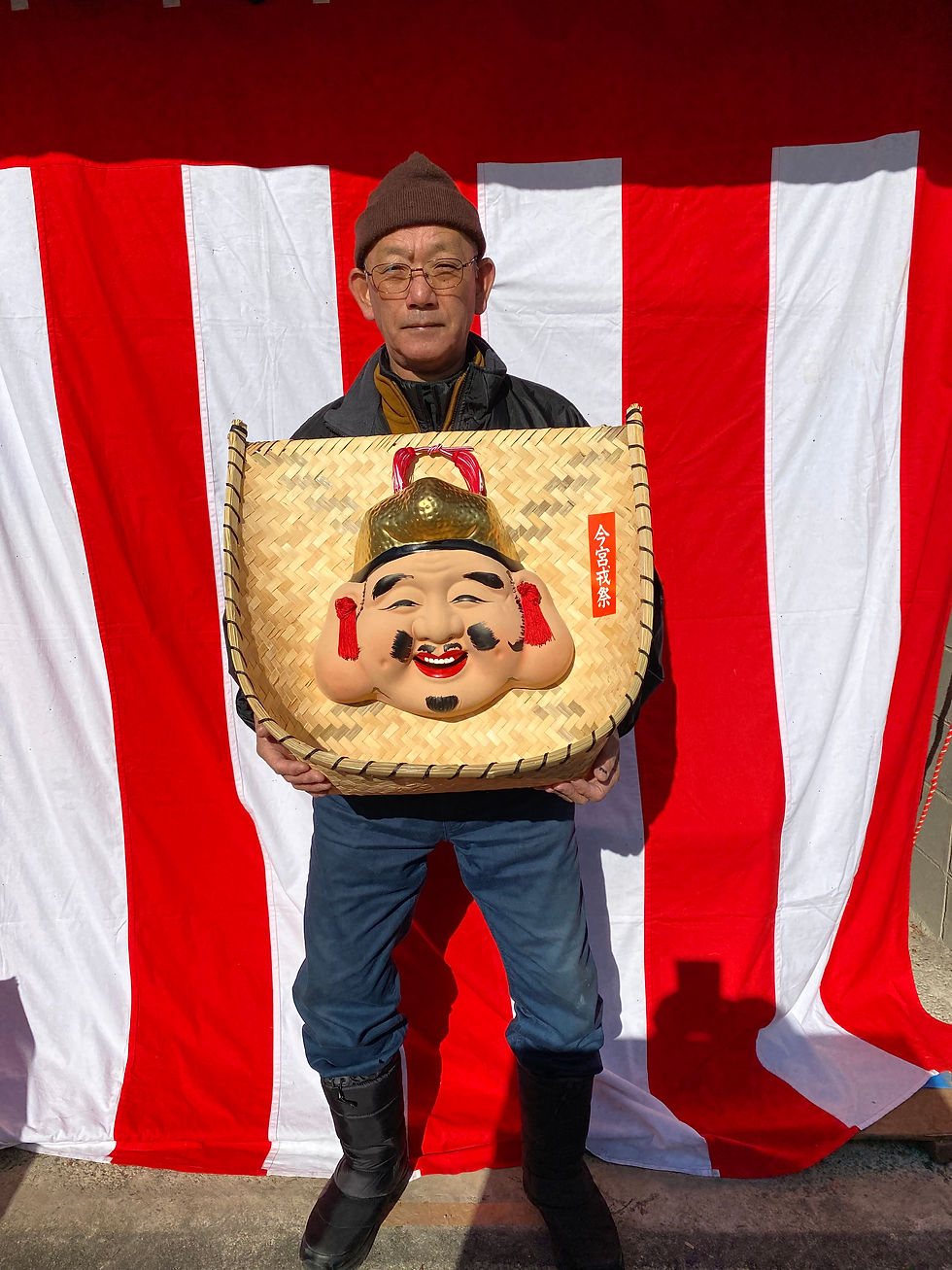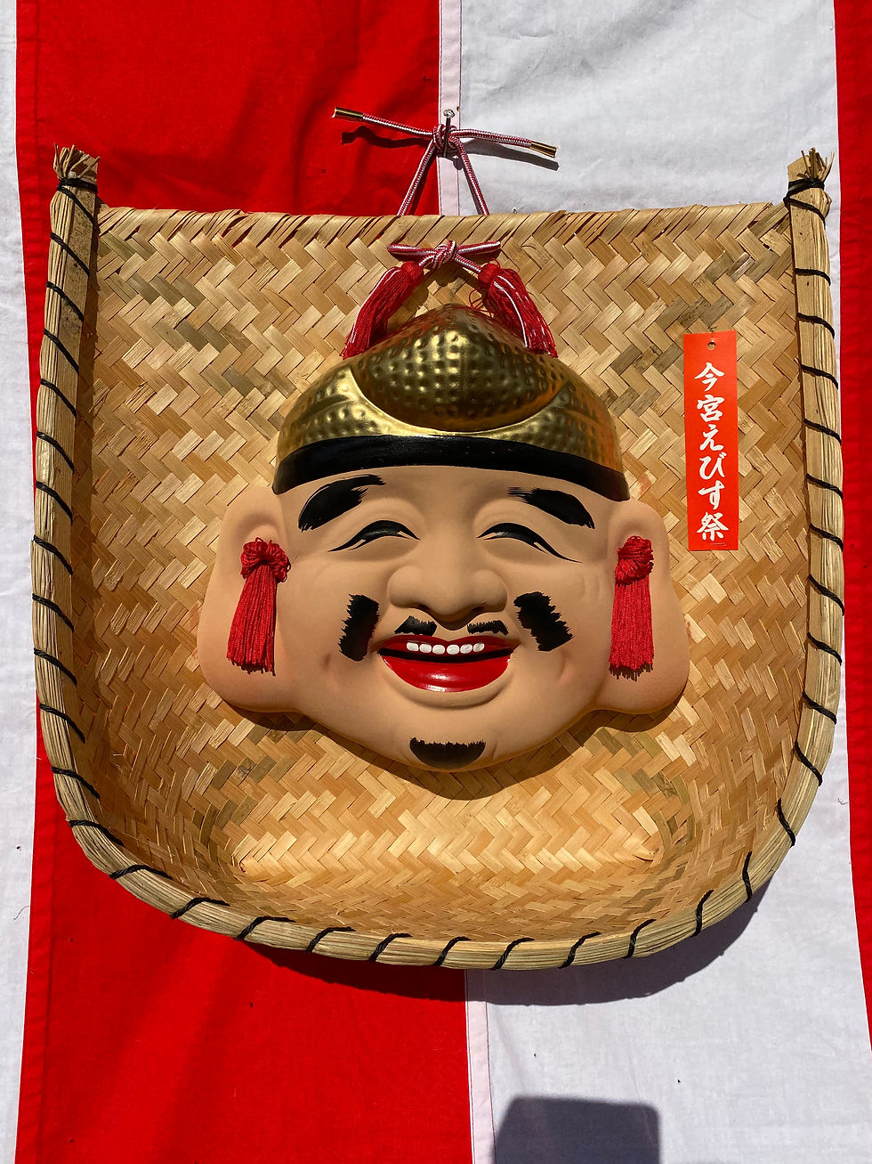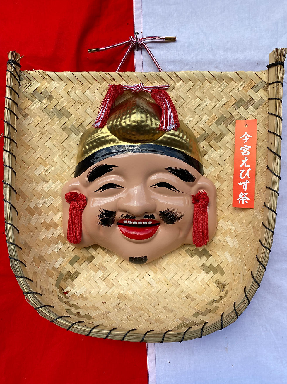 福箕で福をすくって商売繁盛。国産の素焼き面。