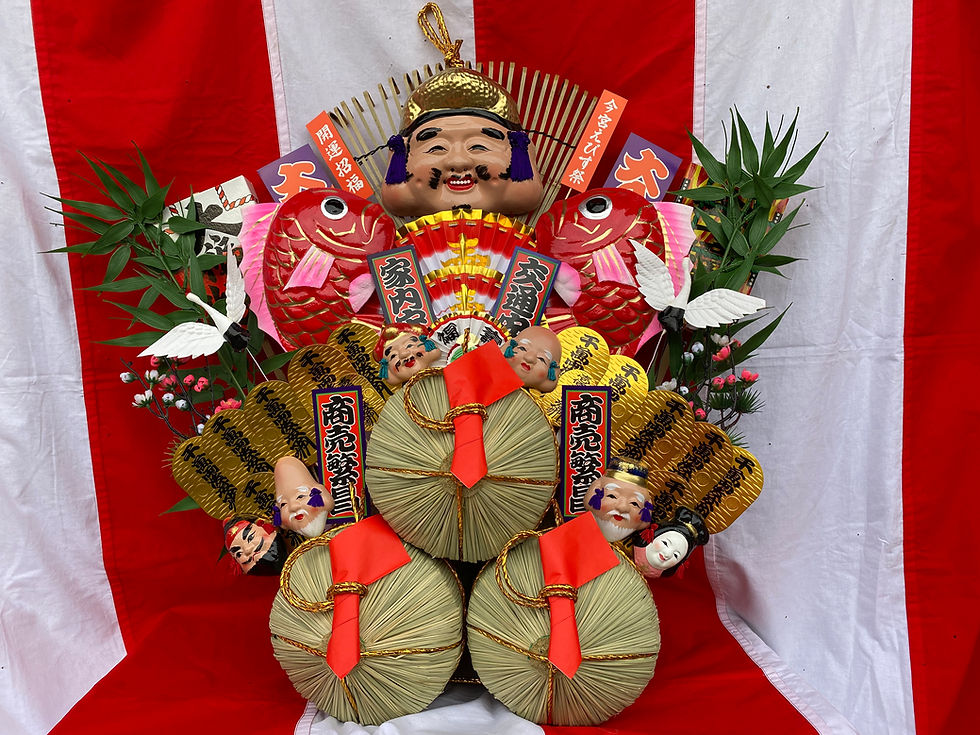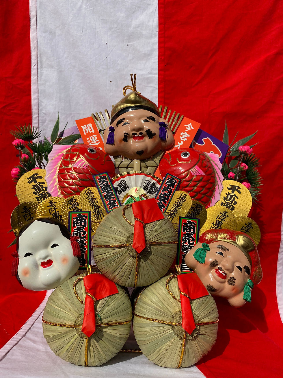 福を招く俵で商売繁盛。面は国産の焼き物。